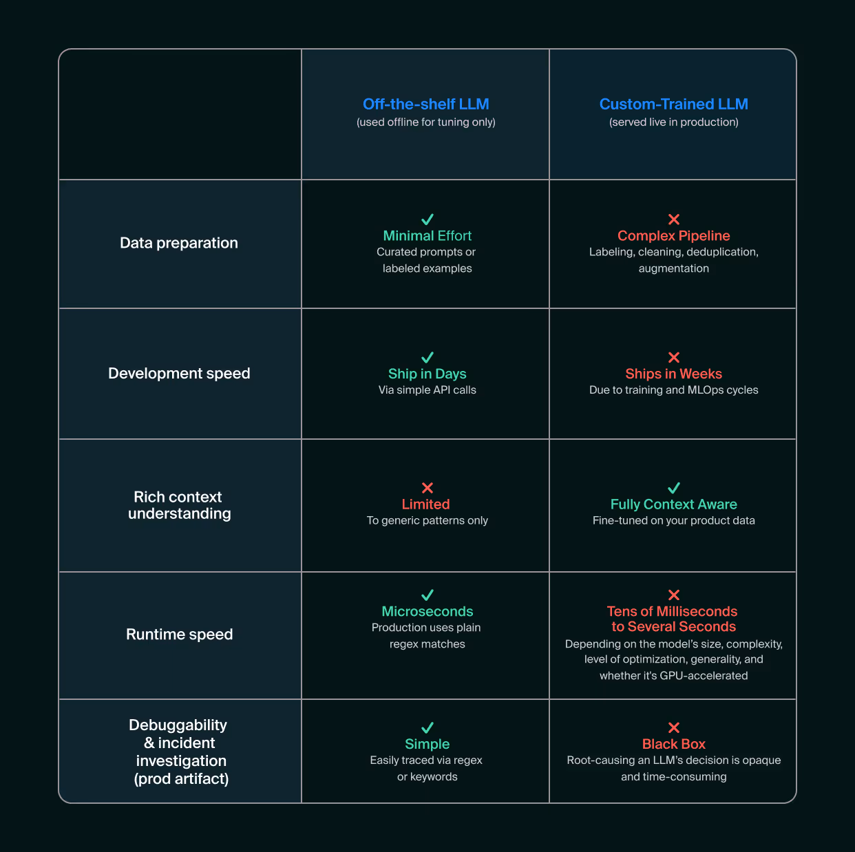 *While we’re aware of many emerging approaches in the world of LLM-based detection, we chose to focus this comparison on just two: off-the-shelf LLMs (used offline for tuning) and custom-trained LLMs served live in production. After evaluating our system’s architecture, capabilities, timeline, and specific needs, these two options emerged as the most relevant and viable for our case. Other approaches, though promising in different contexts, didn’t align as closely with our constraints or objectives.