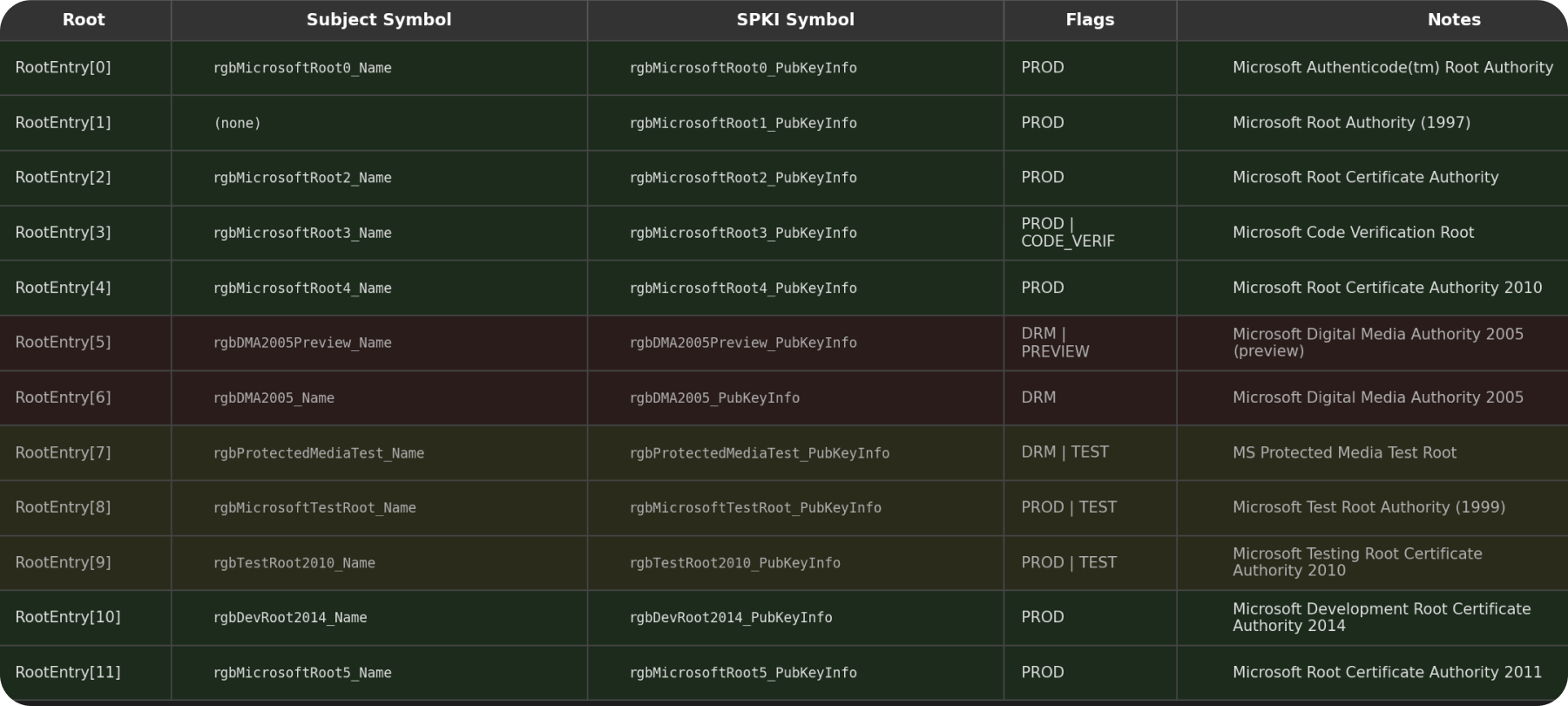 MFKeyIsTrustedRootKey answers a very blunt question: does this signature chain end at a root key we trust? It does that by checking the root certificate’s public key (specifically its SubjectPublicKeyInfo) against a hardcoded allowlist embedded in CI/mincrypt. Each entry in the RootTable contains the DER-encoded subject name, the DER-encoded SubjectPublicKeyInfo, and a flags field that classifies the root (production, test, DRM, etc.). In other words, it doesn’t look at a certificate thumbprint. Rather, it pulls out the root’s key material and verifies that it matches one of the known Microsoft root keys compiled into the binary. Only roots with the production flag are accepted for MicrosoftSignedOnly enforcement. Additionally, the final signing level assignment depends on the EKU OIDs present in the certificate chain.