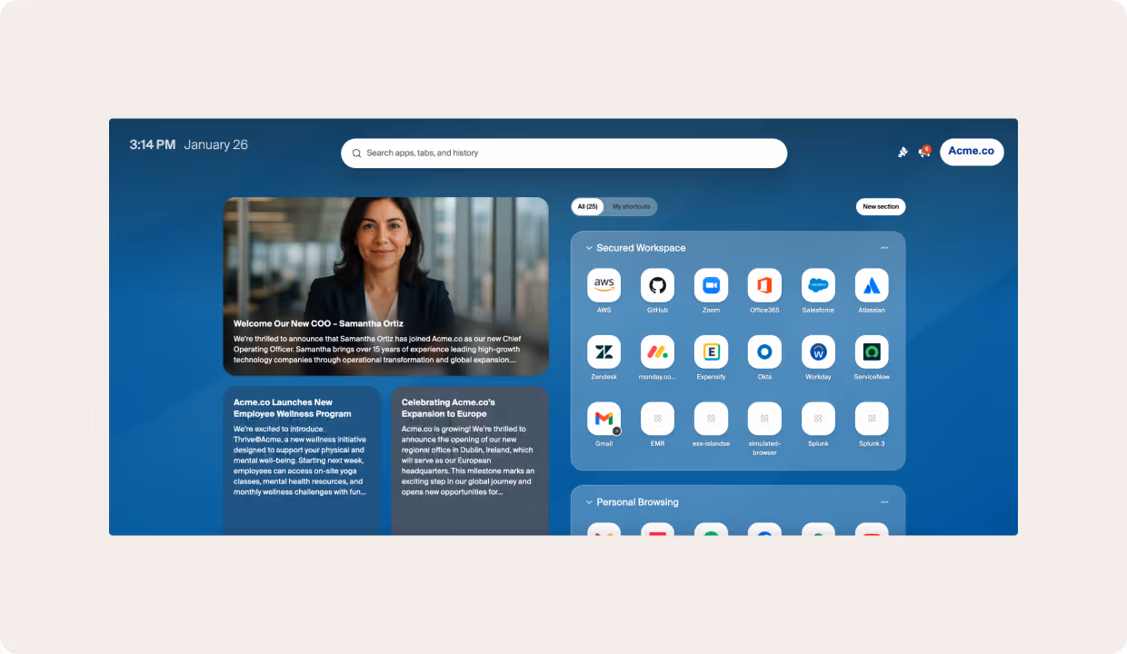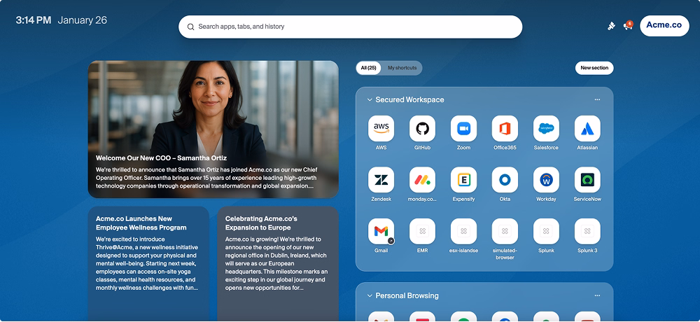 The Island Enterprise Browser homepage lets organizations customize brand imagery, filter websites and applications by groups and individuals, and separate work and personal sites.